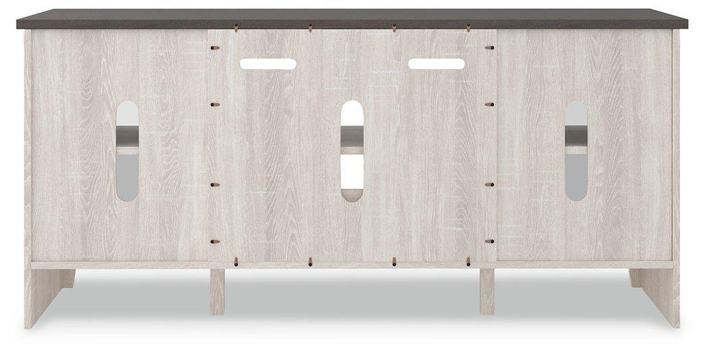 With its two-tone finish and minimalist charm, this TV stand with infrared fireplace insert is right in tune with your relaxed approach to high style. Beautifully made to accommodate your media equipment, it’s well equipped with adjustable shelving, cutouts for wire management and a pair of glass-front doors that enhance the clean-lined aesthetic. The look is ideal for modern farmhouse and contemporary settings. What really turns up the heat: an electric infrared fireplace insert with faux firebrick surround that operates with or without infrared heat and includes a multi flame feature, 7-level temperature setting, five brightness levels and LED glowing embers effect.