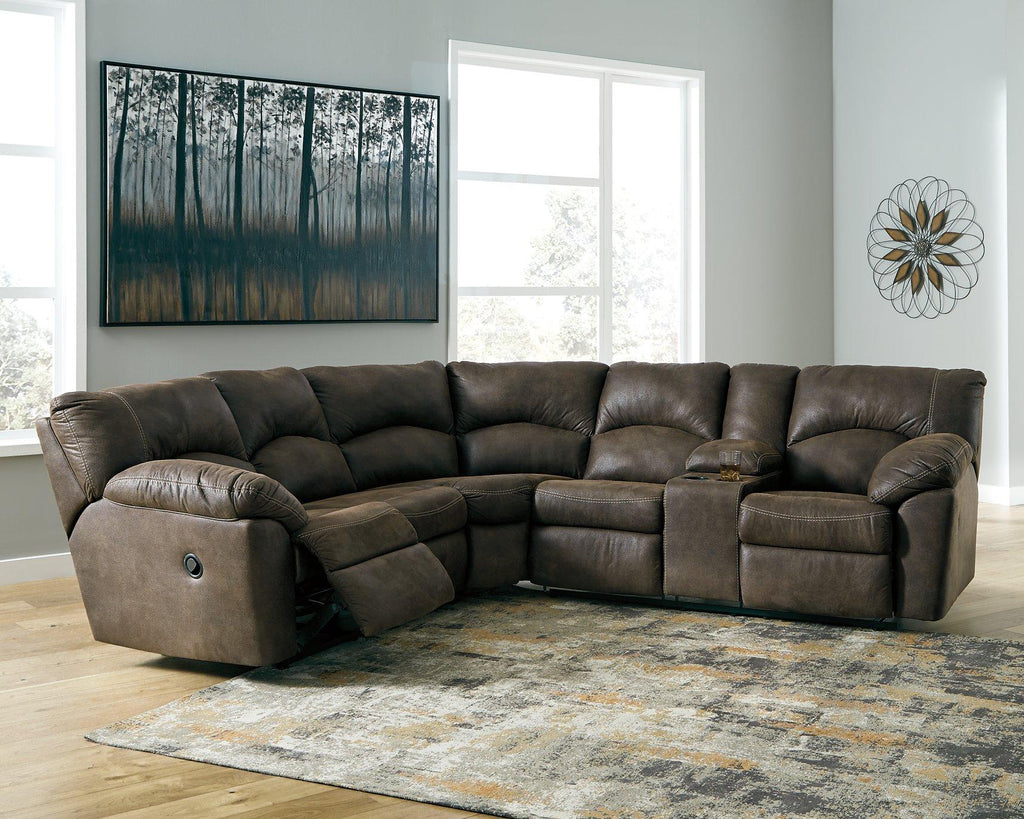 With plush cushions and wraparound pillow top arms, this 2-piece sectional and recliner set takes comfort to a whole new level. Faux vintage leather requires minimal care, making this relaxation station ideal in homes with children and pets. Reclining feature engages with the pull of a tab, putting pleasure at your fingertips.