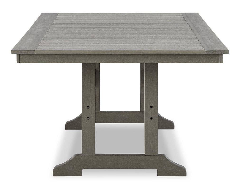 It’s the dawn of a new day for gray. Embrace the style trend with this outdoor dining set. Each piece is crafted of HDPE material, combining the exceptional durability and weather resistance you need with the ‚Äúwood look‚Äù you love. The rectangular table and comfortably cushioned chairs take alfresco living to a whole new level. A slatted table top infuses a plank-style, farmhouse-inspired touch and naturally sheds rainwater. Rest assured, the thick seat and back cushions on the chair are wrapped in Nuvella® high-performance fabric that’s fade-resistant, stain-resistant and a breeze to clean.
